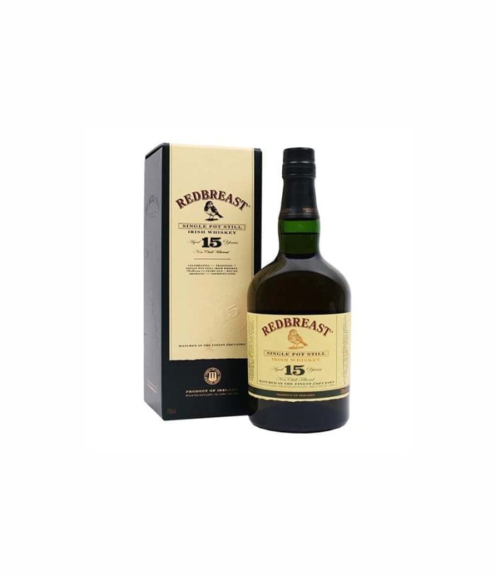 Redbreast е произведено изцяло в традиционните медни дестилатори ирландско уиски, което отбелязва най-високи продажби в света. С плътен аромат и вкус, 15-годишното уиски Redbreast е отлежало в комбинация от испански олоросо шери бурета и американски бърбън бъчви.